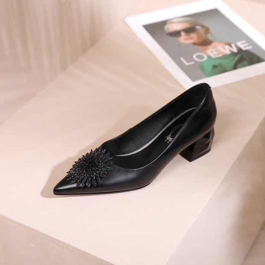 TinaCus Women's Pointed Toe Genuine/Suede Leather Handmade Rhinestone Floral Decor Low Chunky Heel Pumps-black US9