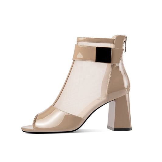 TinaCus Women's Handmade Patent Leather Mesh Peep Toe Chunky Heel Zip Up Summer Ankle Boots