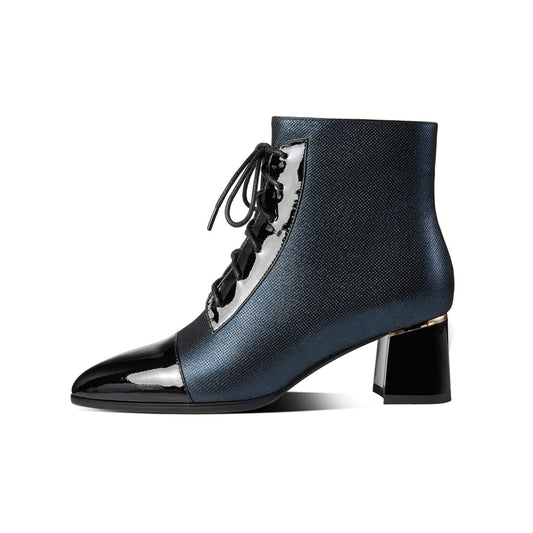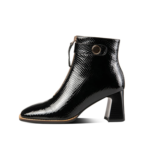 TinaCus Women's Patent Leather Square Toe Handmade Front Zipper Mid Chunky Heels Trendy Ankle Boots