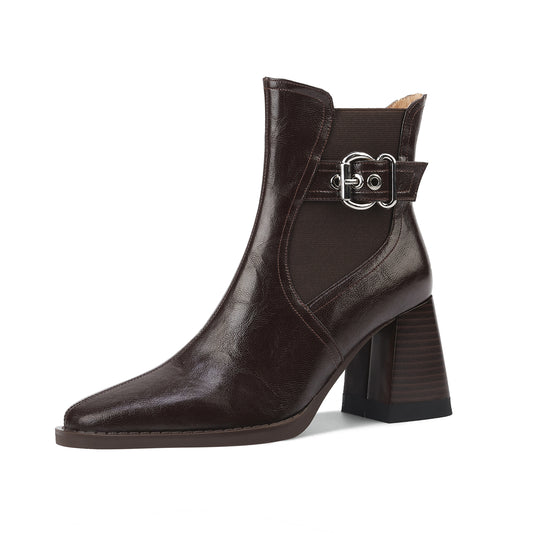 TinaCus Women's Genuine Leather Handmade Chunky Heel Buckle Side Zip Ankle Boots