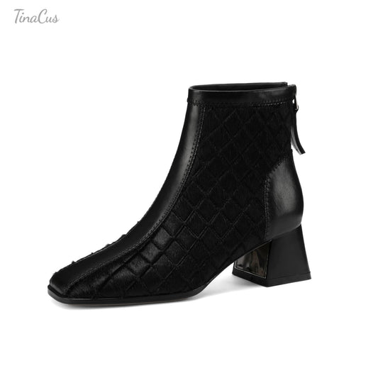 TinaCus Handmade Women's Horsehair Genuine Leather Block Heel Back Zip Ankle Boots