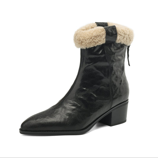 TinaCus Women's Leather Chunky Heel Handmade Buckle Round Toe Fur Snow Booties