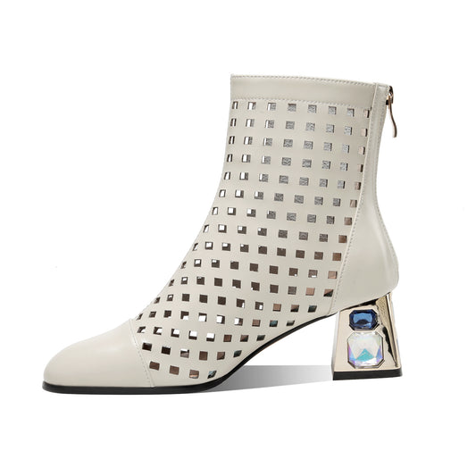 TinaCus Women's Genuine Leather Crystal Chunky Heel Handmade Back Zip Hollow Summer Ankle Boots