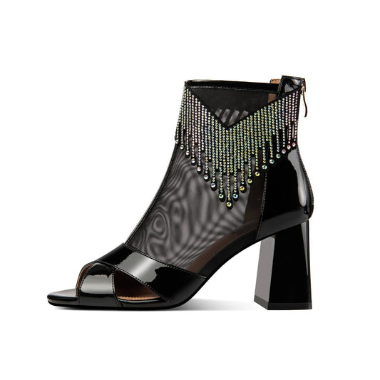 TinaCus Women's Handmade Patent Leather Mesh Glitter Rhinestone Chunky Heel Back Zip Up Sandals Summer Ankle Boots