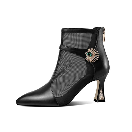TinaCus Women's Genuine Leather and Mesh Handmade Spool Heel Zip Up Crystal Decor Stylish Ankle Boots
