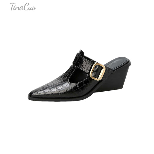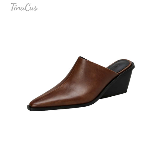 TinaCus Handmade Women's Genuine Leather Pointed Toe Wedge Heel Backless Mules Shoes