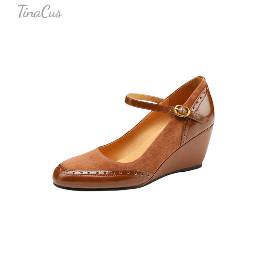 TinaCus Handmade Women's Suede Leather Oxford Round Toe Buckle Wedge Heel Mary Jane Shoes