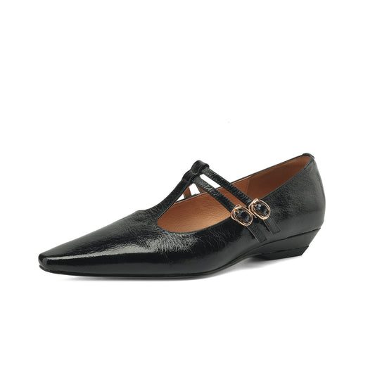 TinaCus Women's Handmade Genuine Leather Pointed Toe Chunky Heel T-Strap Double Buckle Pumps