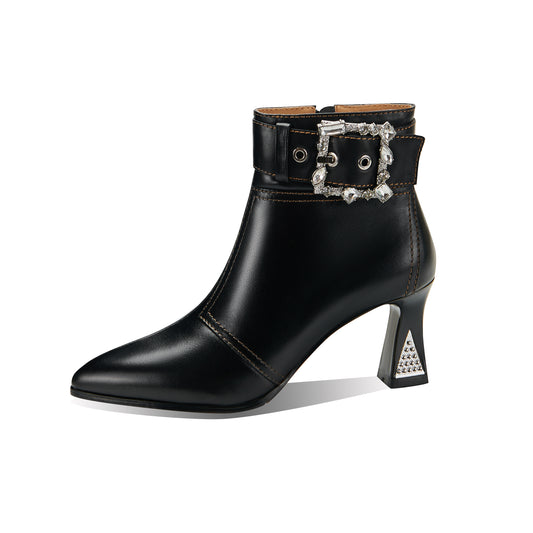 TinaCus Women's Genuine Leather Pointed Toe Handmade Side Zip Up Rhinestone Buckle Mid Heel Ankle Boots