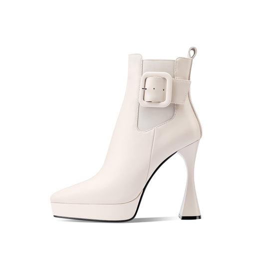 TinaCus Women's Genuine Leather Buckle Platform High Heel Side Zip Up Pointed Toe Handmade Ankle Boots