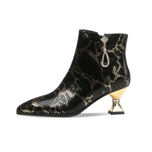 TinaCus Handmade Women's Genuine Leather Sexy Rhinestones Printed Side Zipper Pointed Toe Mid Spool Heel Ankle Boots