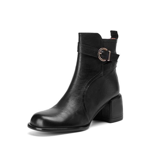 TinaCus Women's Genuine Leather Modern Buckle Handmade Chunky Heel Side Zip Ankle Boots