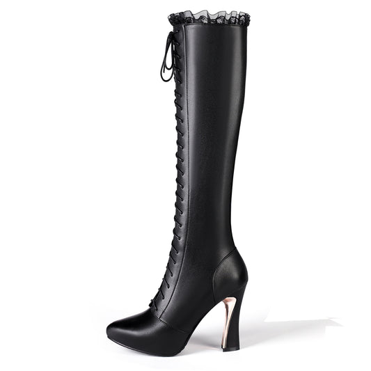 TinaCus Handmade Women's Genuine Leather High Heel Zip Up Knee High Boots with Lace