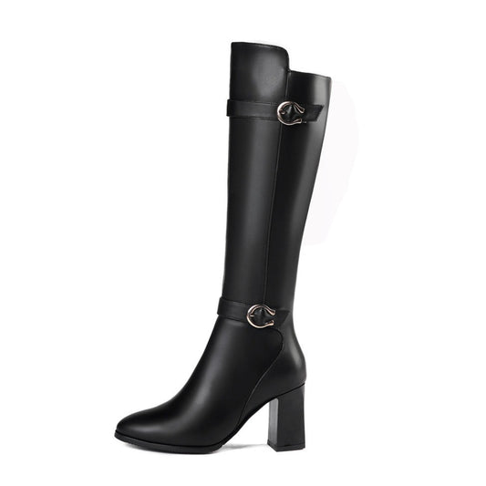 TinaCus Women's Genuine Leather Pointed Toe Side Zip Handmade High Chunky Heel Plus-size Customized Circumference Knee High Boots with Buckle