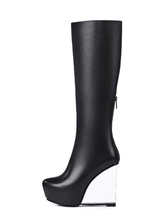 TinaCus Women's Handmade Genuine Leather Round Toe Transparent High Heel Half Zip Up Knee High Boots with Platform