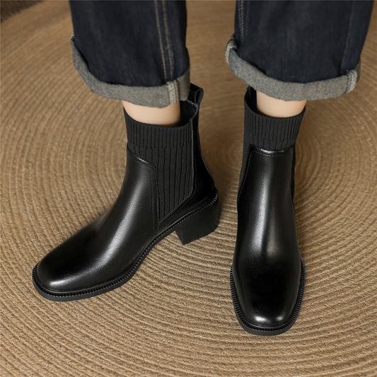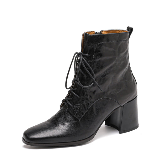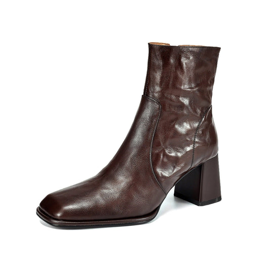 TinaCus Genuine Leather Handmade Short Boots Women's Square Toe Chunky Heels Zipper & Selftie Booties
