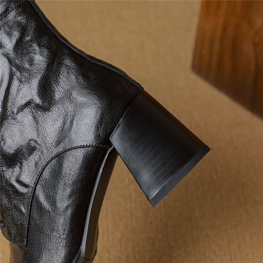 TinaCus Genuine Leather Mid Chunky Heels Ankle Boots Women's Pointed Toe Handmade Back Zipper