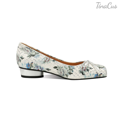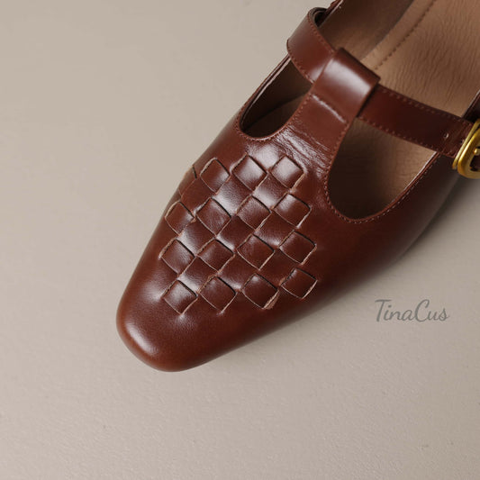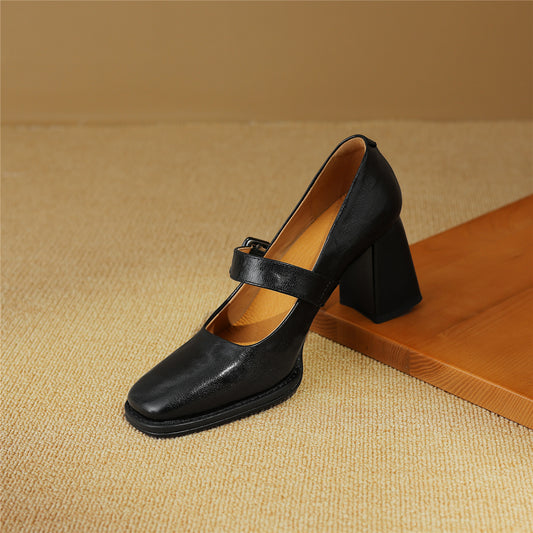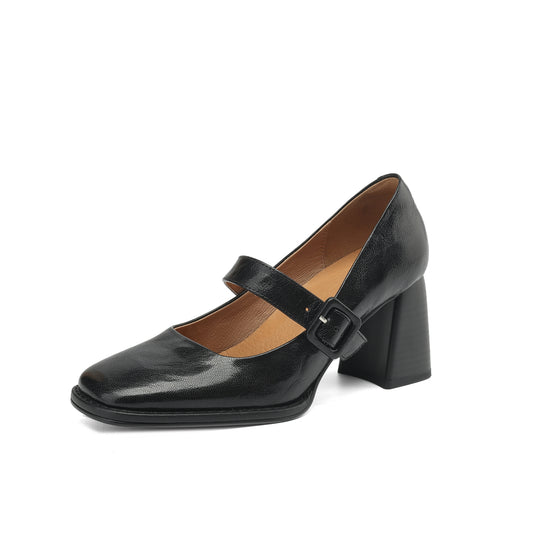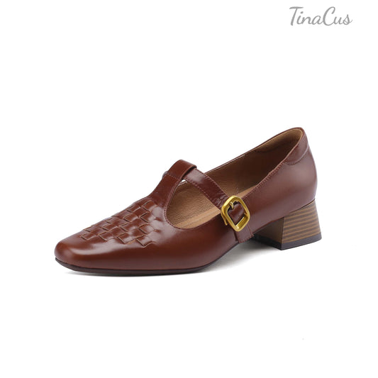 TinaCus Women's Leather Pumps Handmade Ankle Strap Square Toe Embroidered Chunky Heel