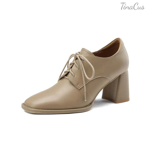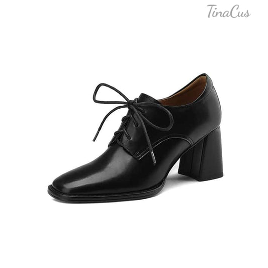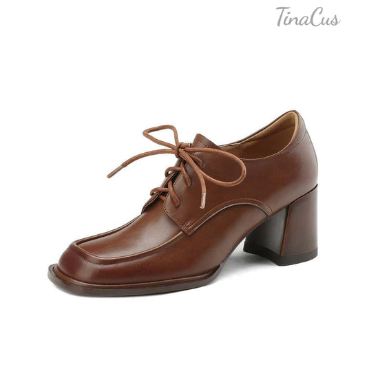 TinaCus Women's Square Toe Lace up Oxford Shoes Genuine Leather Handmade Low Chunky Heels
