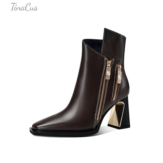 TinaCus Dual Zippers Chic Ankle Boots Women's Square Toe Mid Chunky Heels Genuine Leather Booties