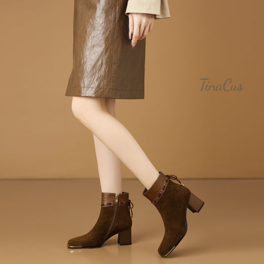 TinaCus Zipper with Lace up Ankle Boots Women's Square Toe Suede & Genuine Leather Mid Chunky Heels Handmade Booties