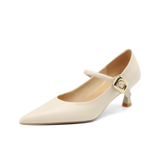 TinaCus Handmade Genuine Leather Women's Closed Pointed Toe Mid Kitten Heel Vintage Pump Shoes with Buckle Decor