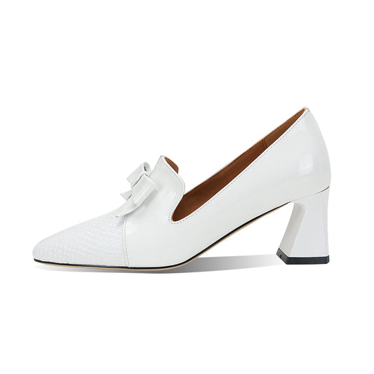 TinaCus Handmade Women's Genuine Leather Slip On Bow Square Toe High Chunky Heel Pumps Shoes