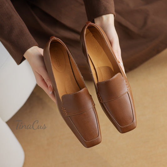 TinaCus Women's Square Toe Genuine Leather Handmade Chunky Heels Slip-on Casual Loafers Shoes
