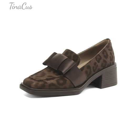 TinaCus Women's Square Toe Genuine Leather with Satin Bowknot Handmade Chunky Heels Trendy Loafers Shoes