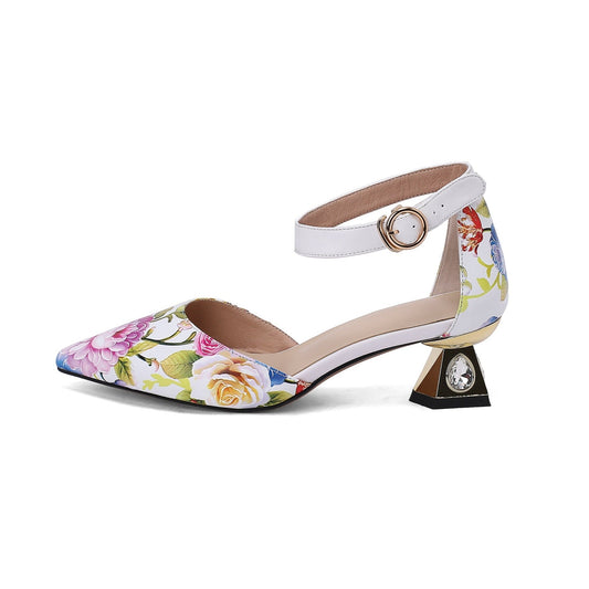 TinaCus Women's Pointed Toe Embroidered Floral Print Genuine Leather Handmade Buckle Chunky Heel Sandal Pumps