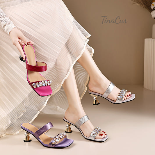 TinaCus Women's Open Toe Genuine Leather Handmade Mid Heels Sandals Slippers with Rhinestones