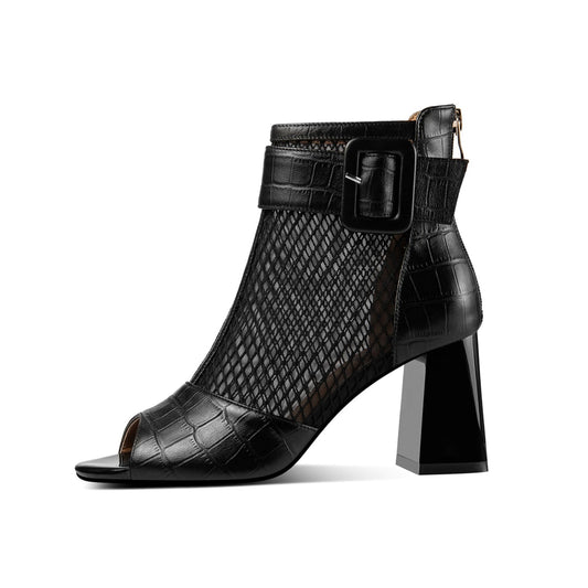 TinaCus Women's Handmade Patent Leather Mesh Peep Toe Chunky Heel Zip Up Summer Ankle Boots