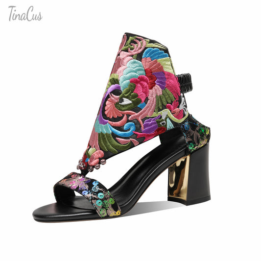 TinaCus Women's Handmade Embroidery Genuine Leather Open Toe Block Heel Sandals