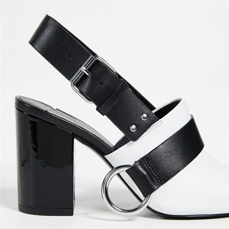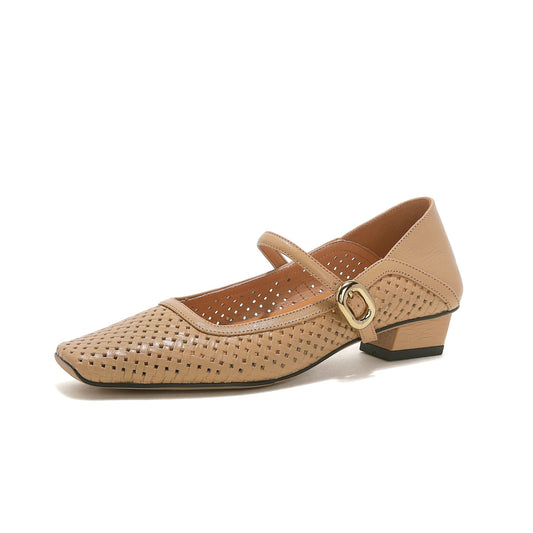 TinaCus Women's Square Toe Handmade Genuine Leather Hollow Buckle Chunky Heel Sandal Pumps
