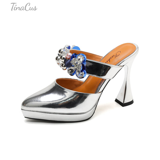TinaCus Pointed Toe Genuine Leather Handmade Flower Women's High Heels Mules with Platform
