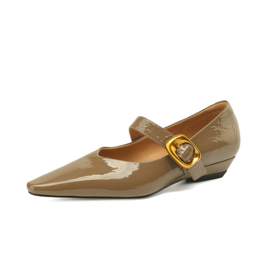 TinaCus Mary-Jane-Schuhe für Damen, handgefertigt, Lackleder, spitze Zehenpartie, klobiger Absatz, goldene Schnalle