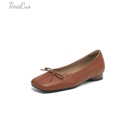 TinaCus Handmade Women's Genuine Leather Square Toe Stitching Office Dress Ballet Flats Shoes with Bowknot
