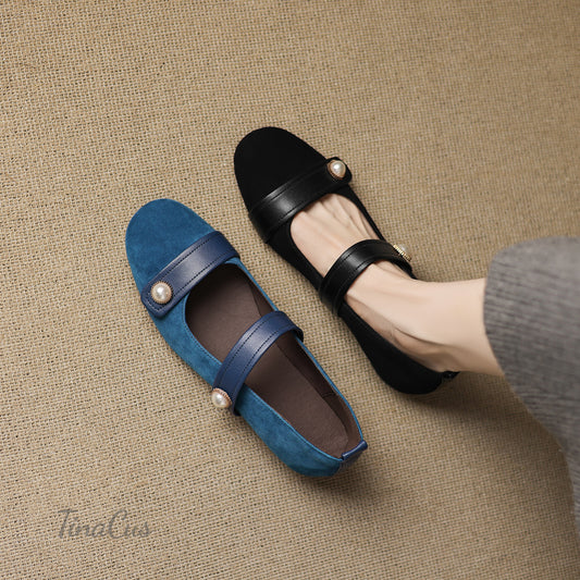 TinaCus Women's Round Toe Suede & Genuine Leather Handmade Mary Jane Flat Shoes with Pearls