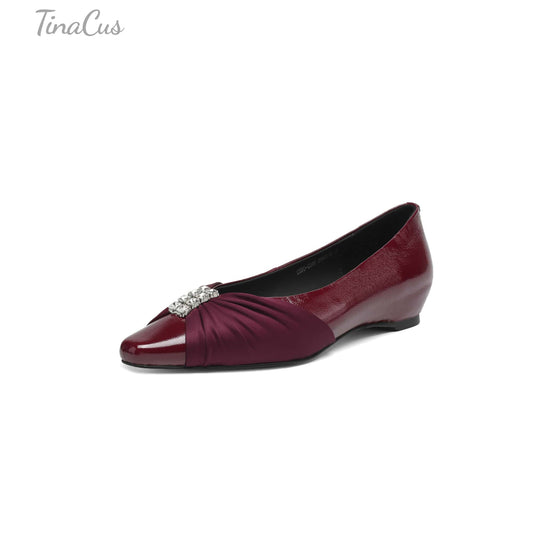 TinaCus Handmade Women's Genuine Leather Closed Toe Ruched Rhinestone Ballet Flat Shoes
