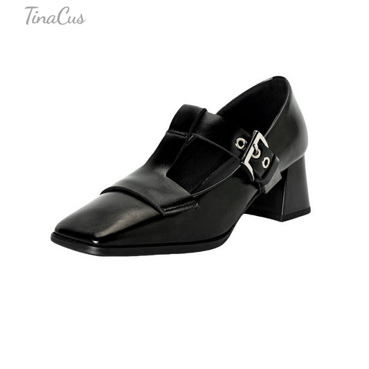 TinaCus Genuine Leather Women's Square Toe Handmade Strap Buckle Mid Chunky Heels Stylish Mary Jane Shoes