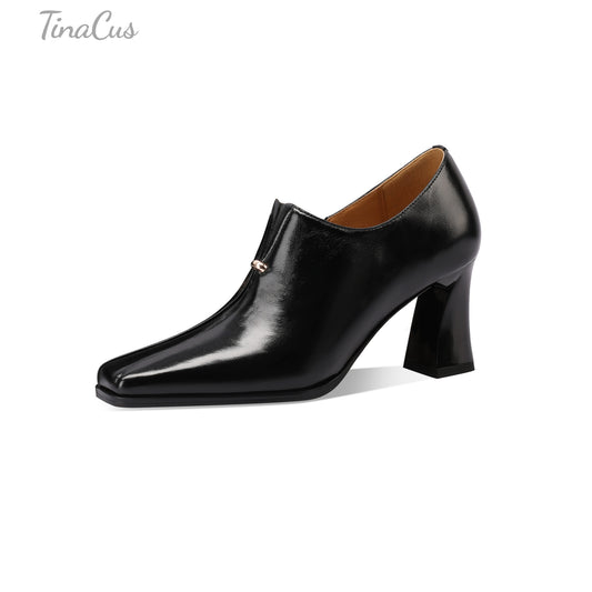 TinaCus Genuine Leather Handmade Side Zipper Women's Square Toe Mid Spool Heels Trendy Pumps Shoes