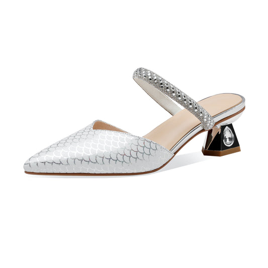 TinaCus Printed Genuine Leather Women's Pointed Toe Handmade Rhinestoes Décor Low Chunky Heels Slippers