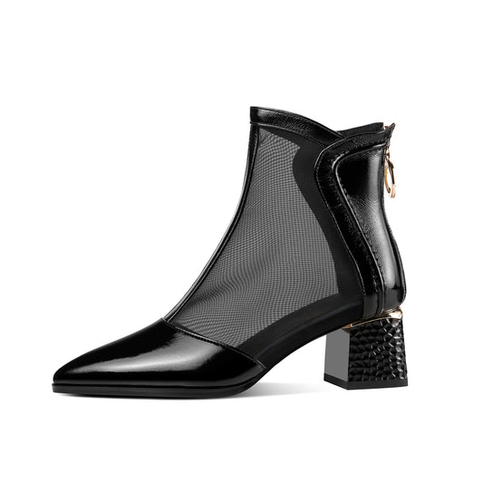 TinaCus Damen-Stiefeletten, handgefertigt, spitze Zehenpartie, Lackleder, Reißverschluss hinten, klobiger Absatz, Netzstoff, Sommer
