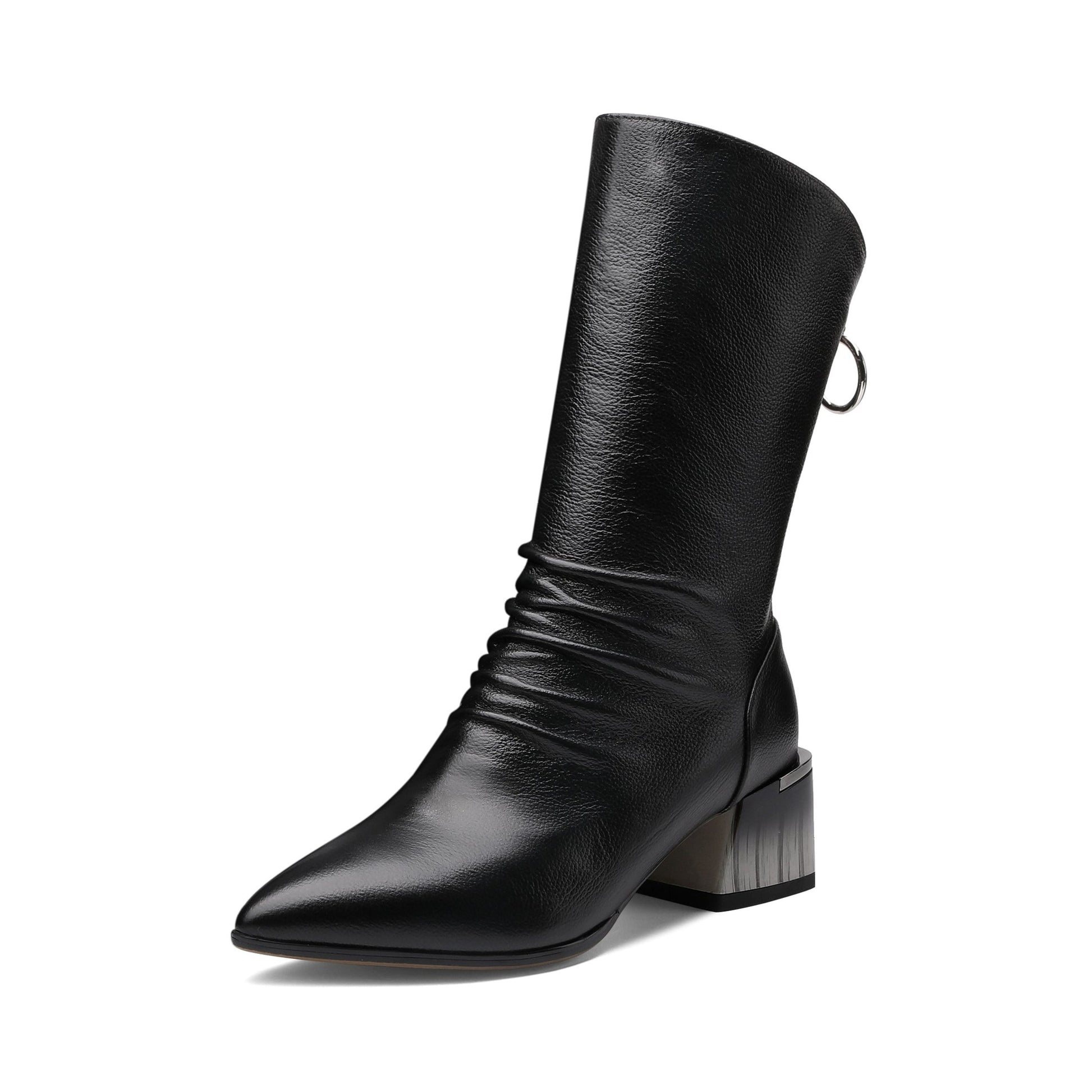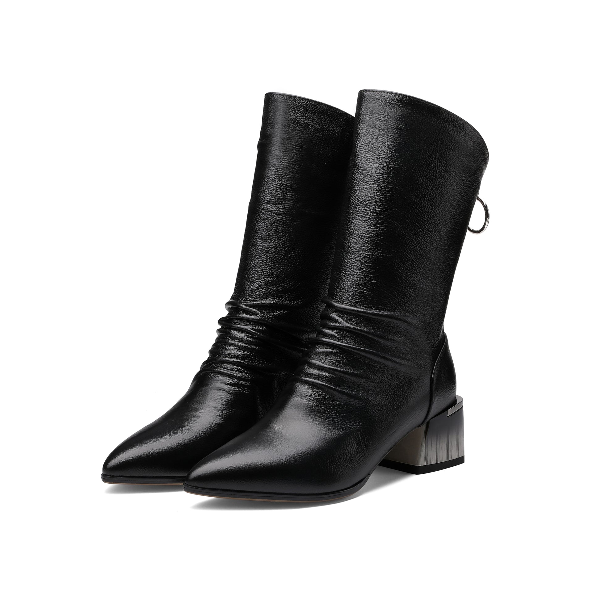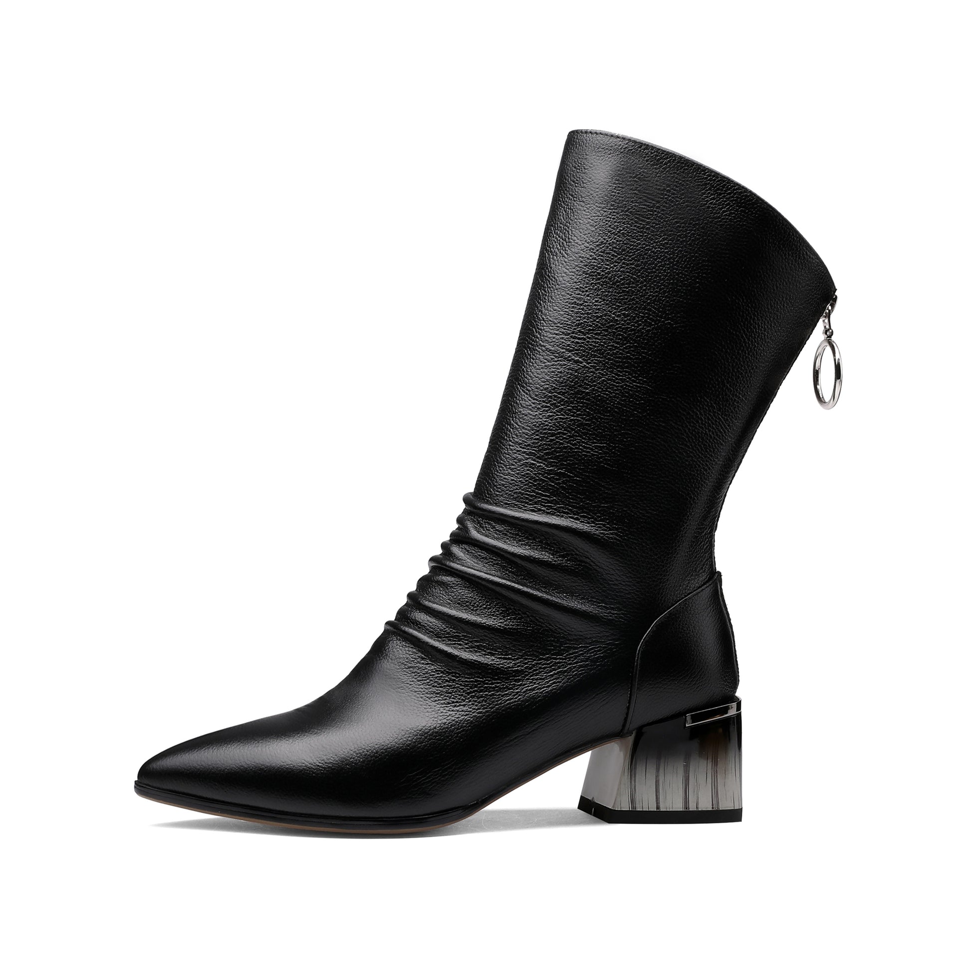 Bequeme, halbhohe Stiefel aus echtem Leder mit spitzer Spitze, mittelhohem Blockabsatz und Rüschendesign, um mit dem Modetrend Schritt zu halten, und einer rutschfesten Sohle, die Ihr Selbstvertrauen bei jedem Schritt zeigt.