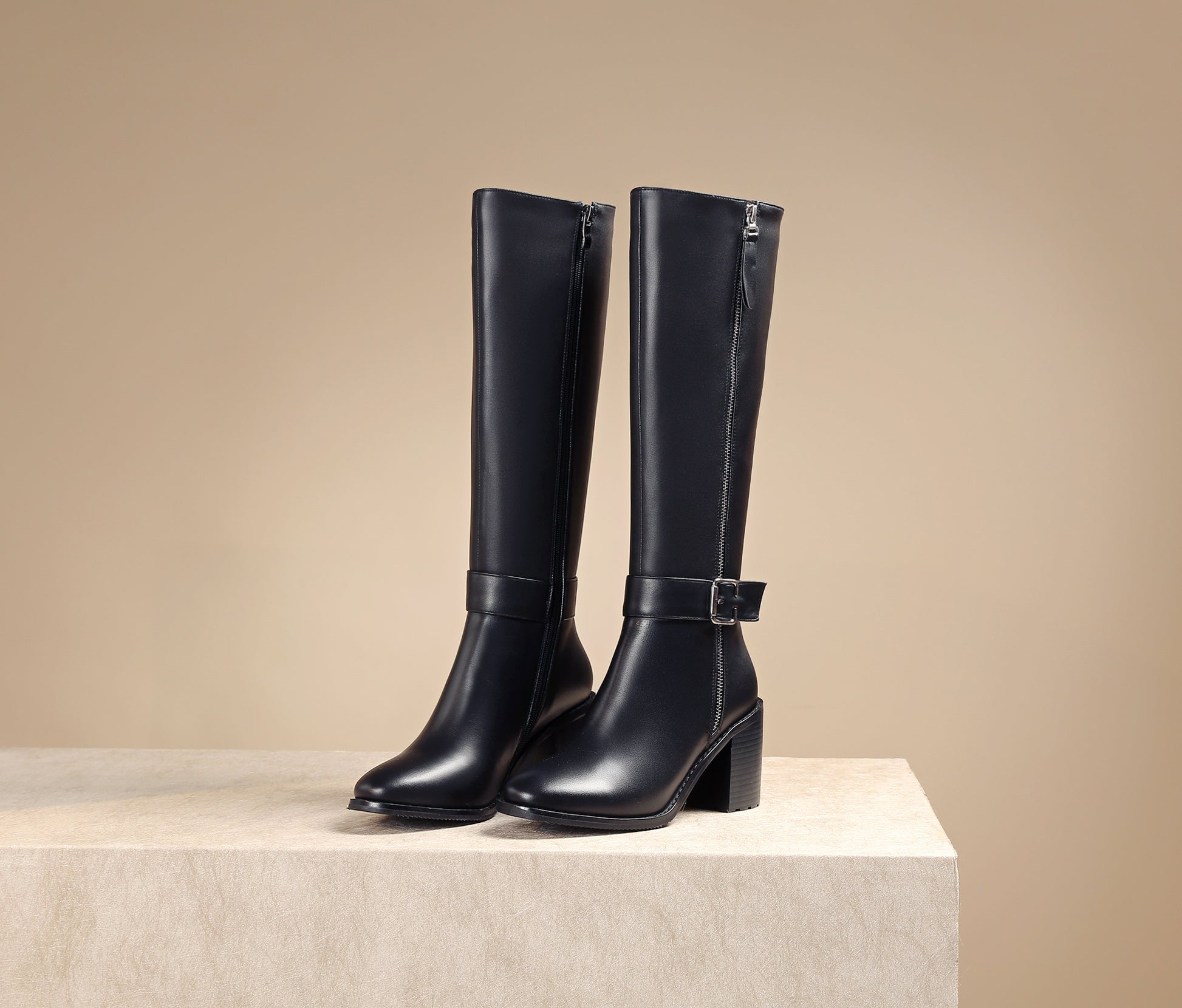 Schicke kniehohe Stiefel aus echtem Leder, mit runder Spitze, Schnalle, Doppelreißverschluss und hohem, klobigem Absatz, um mit dem Modetrend Schritt zu halten.