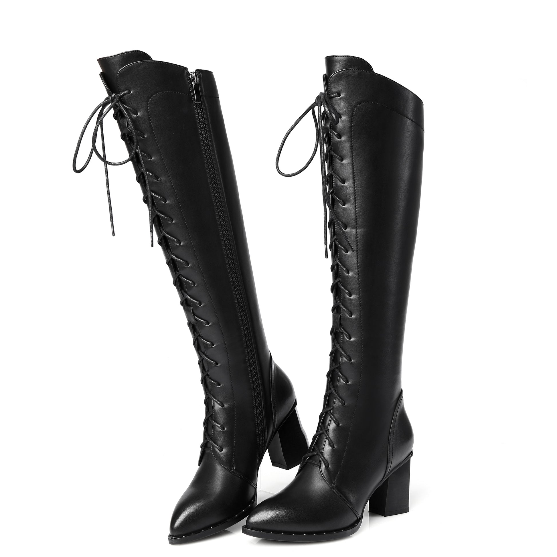 Stilvolle kniehohe Stiefel aus echtem Leder mit spitzer Spitze, Schnürung, seitlichem Reißverschluss und mittelhohem Absatz passen zu fast allen Ihren Outfits.
