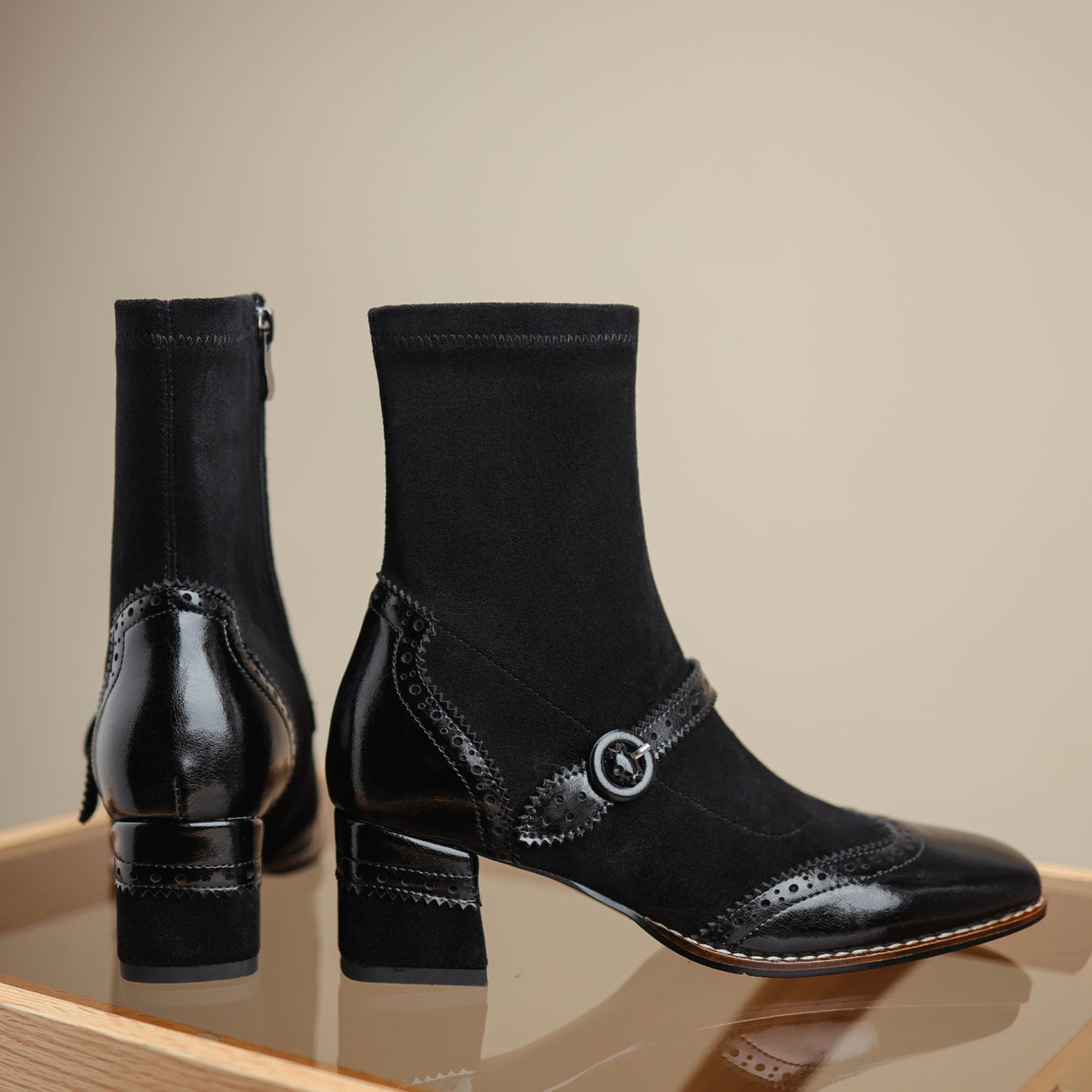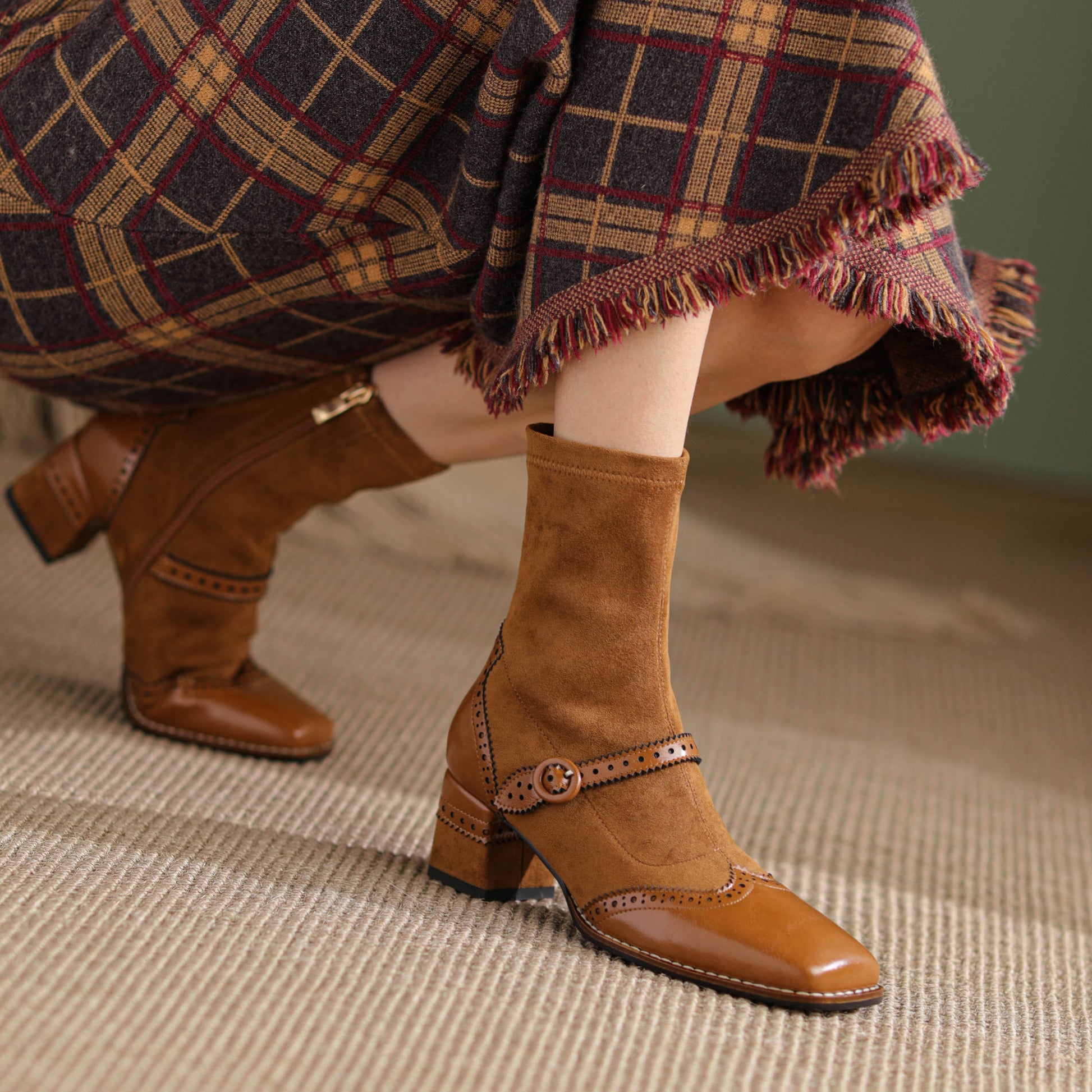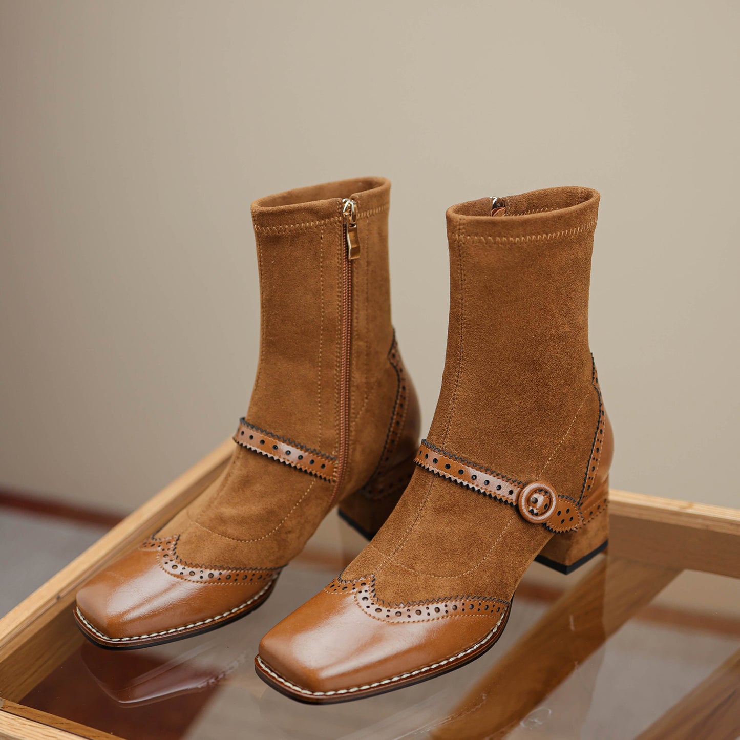 TinaCus Damen-Stiefeletten aus echtem Wildleder, handgefertigt, mit Spitze, seitlichem Reißverschluss, quadratischer Zehenpartie, mittlerem Blockabsatz