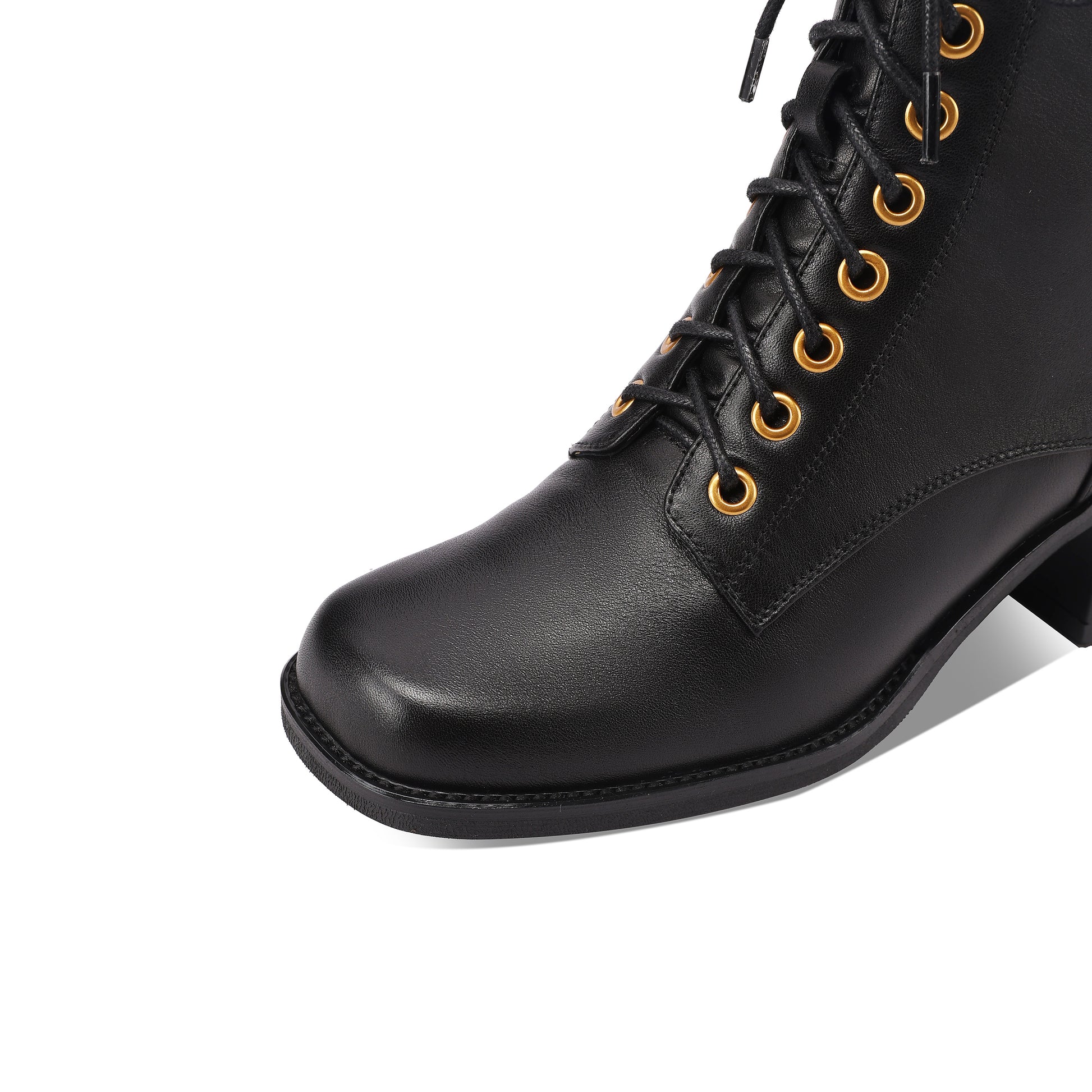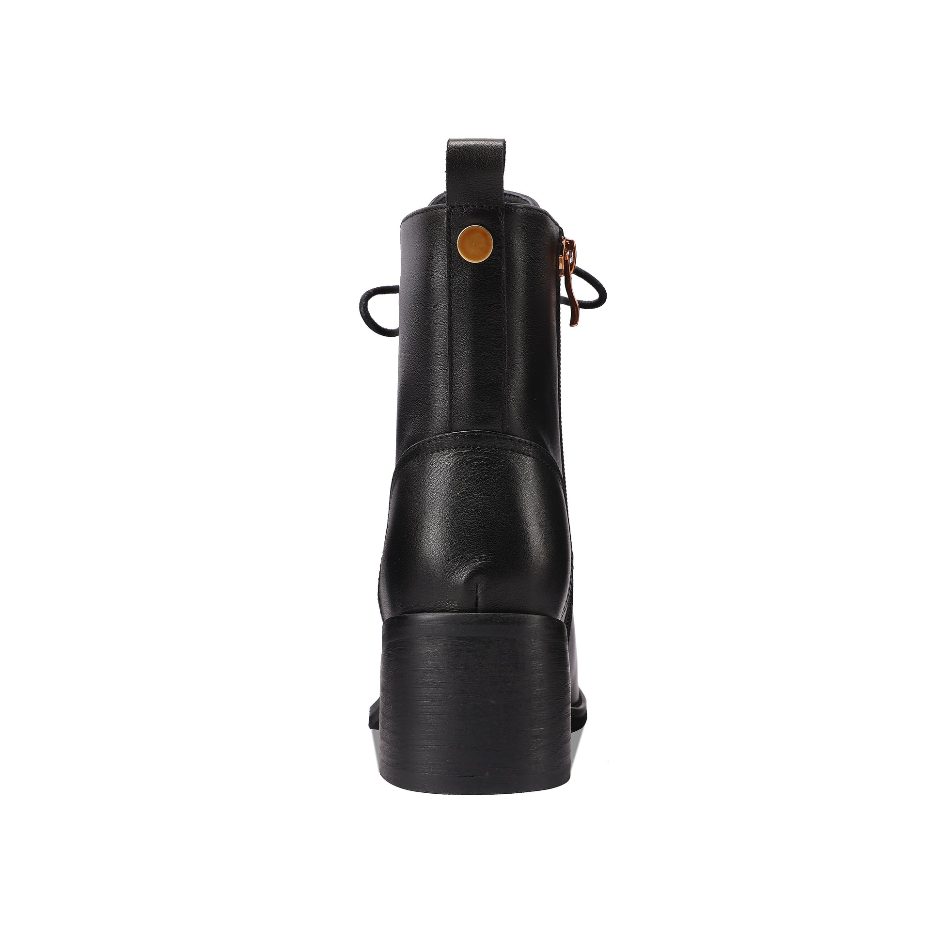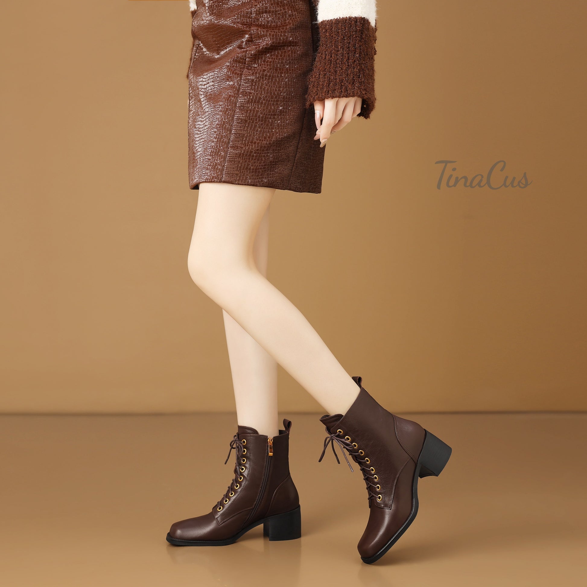 Ankle boots designed with genuine leather, round toe, mid heels, lace up and zipper to keep up with fashion trend