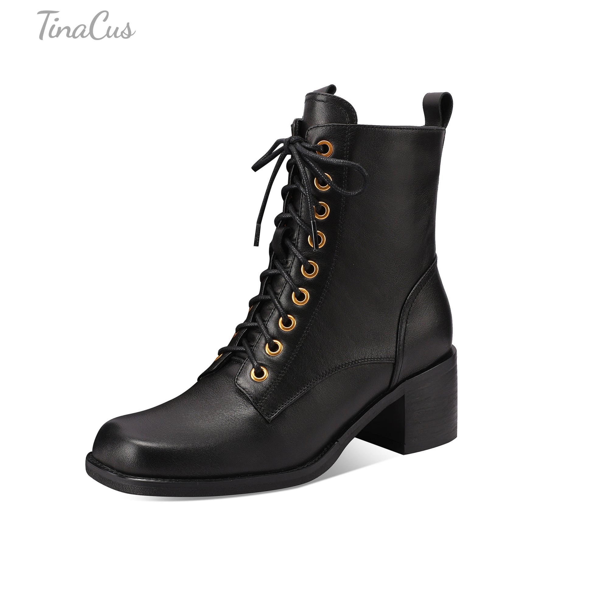 TinaCus Genuine Leather Handmade Short Boots Women's Square Toe Chunky Heels Zipper & Selftie Booties