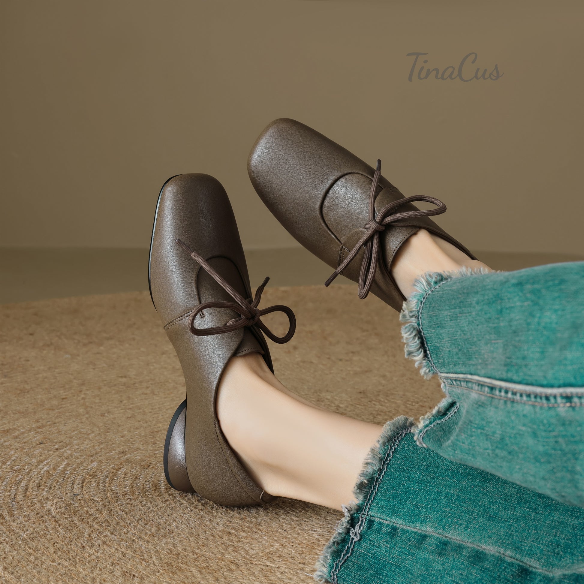 TinaCus Genuine Leather Women's Round Toe Handmade Selftie Low Chunky Heels Casual Oxford Shoes